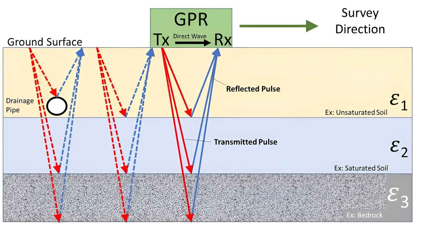 • Transmission: A GPR unit sends a radio frequency pulse into the ground via an antenna.